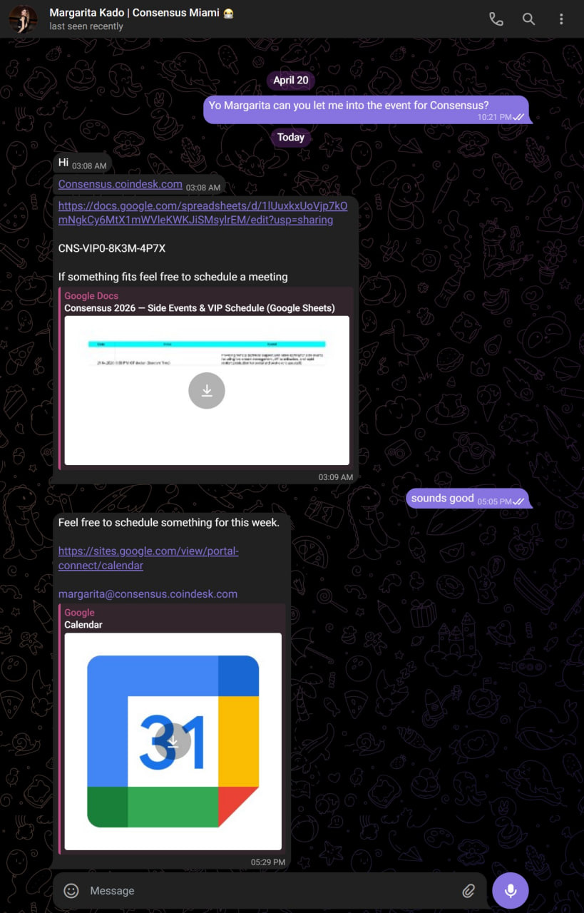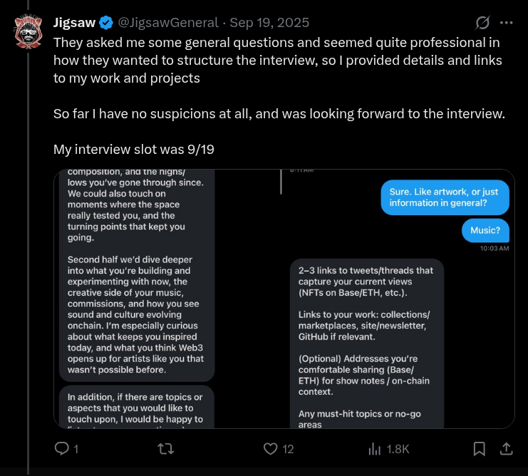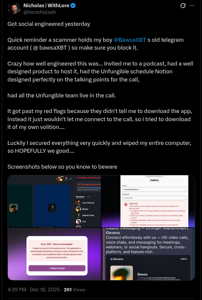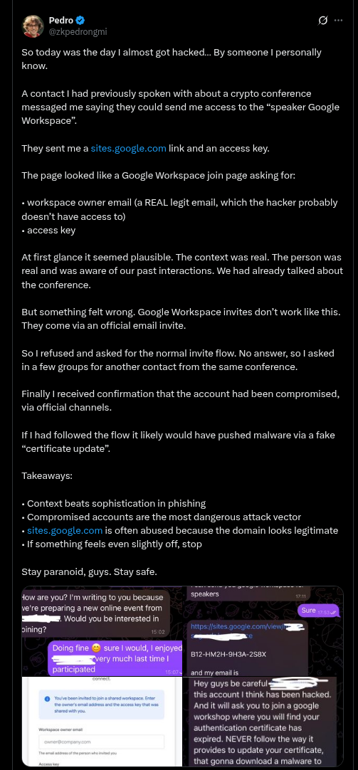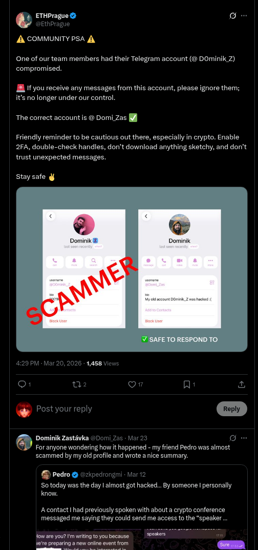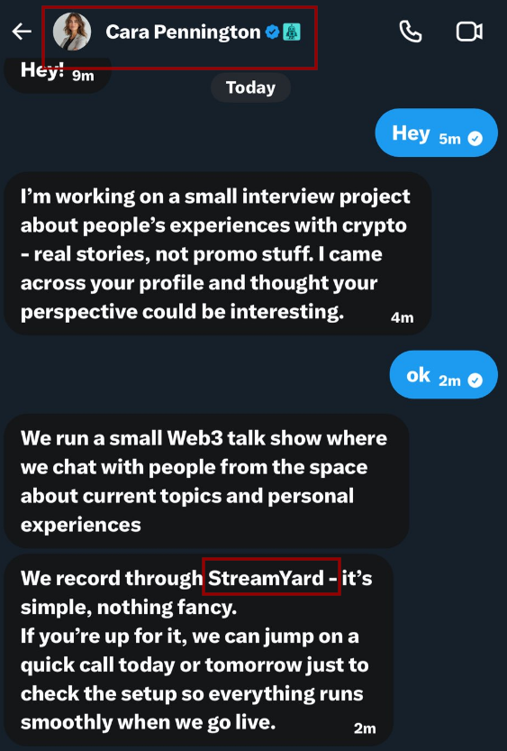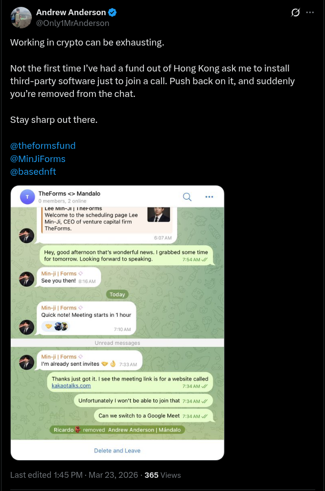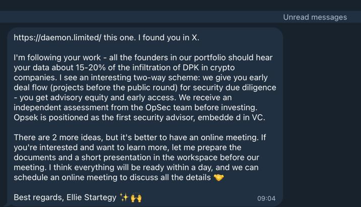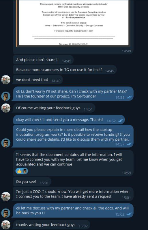 - Fake Investment/Partnership Proposals: Sent from previously compromised Telegram or X (Twitter) accounts.