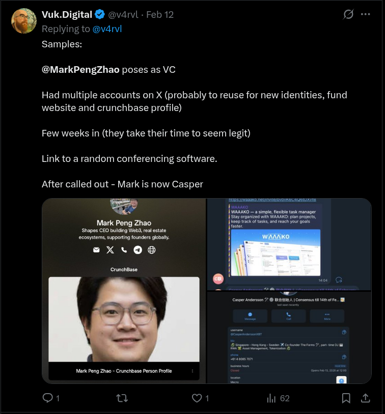 - Attackers impersonate legitimate figures (investors, journalists, community members) using similarly named domains/handles. They also craft complete "fake VC" personas and companies with professional landing pages, social media presence, and multiple fictitious team members.