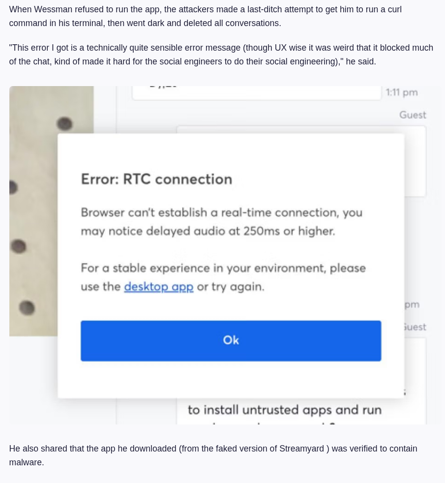 Users will be asked to pre-install attackers controlled applications or update their software during the recording phase. Such applications are used across a variety of different social engineering tactics and are not limited only to fake podcast invites.