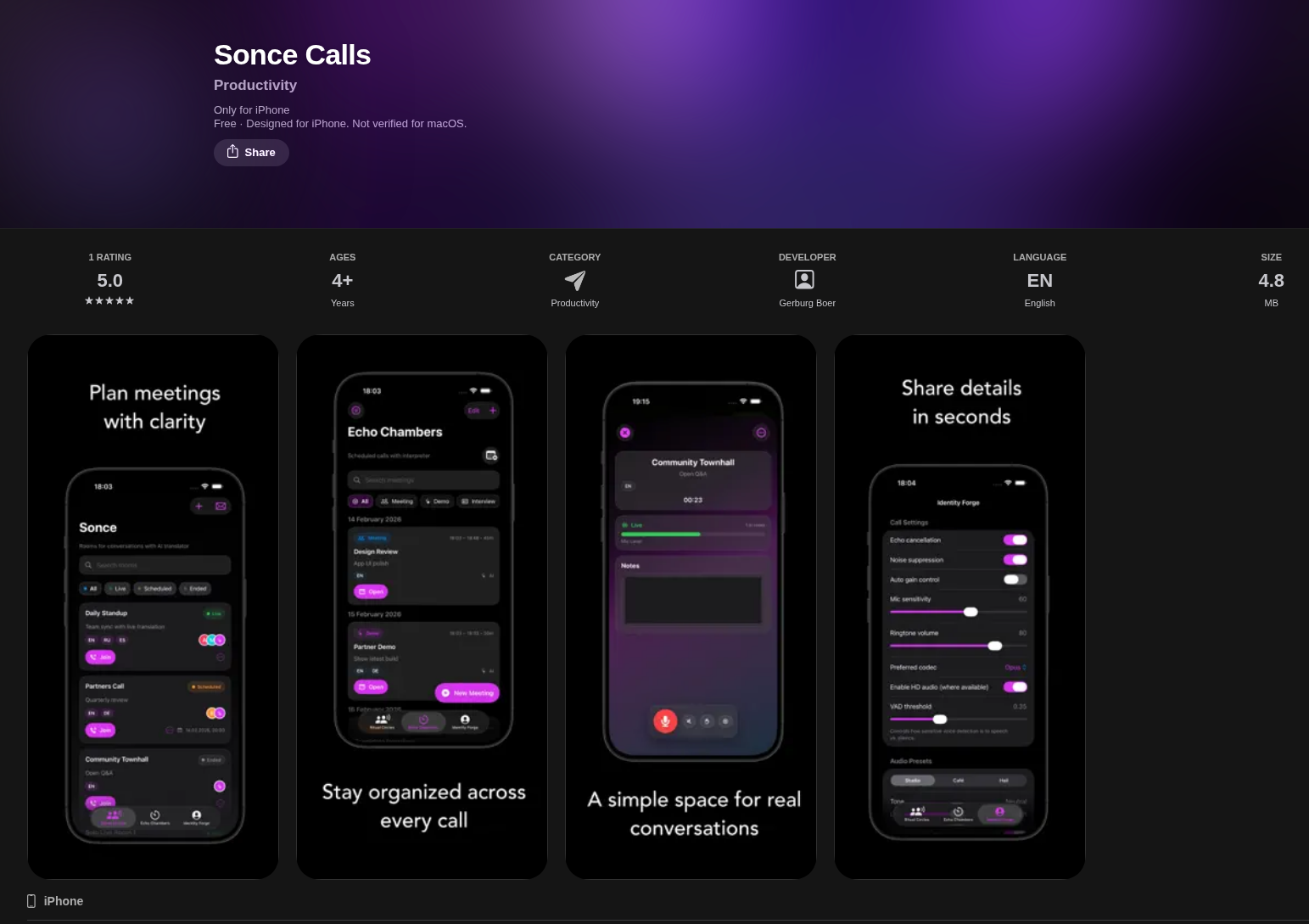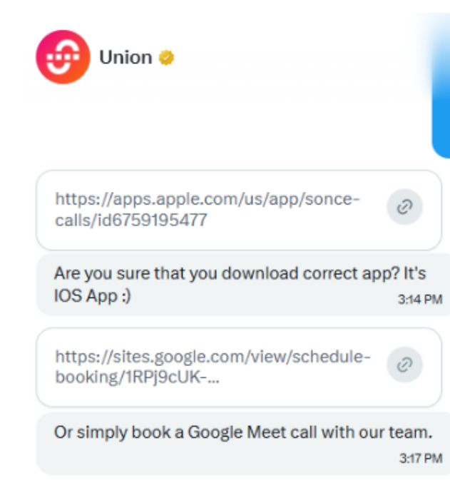 In the other instance, threat actors used a compromised X (Twitter) account of a high reputation project (@union_build) to solicit a future meeting. However, this time, besides fake meeting scheduler application hosted at https://sites.google[.]com/view/schedule-booking/1RPj9cUK-N6qGySqwFBzjz70CsnFb1geV attackers also offered an alternative option in form of iOS native application “SonceCalls” hosted at Apple Store - https://apps.apple.com/us/app/sonce-calls/id6759195477