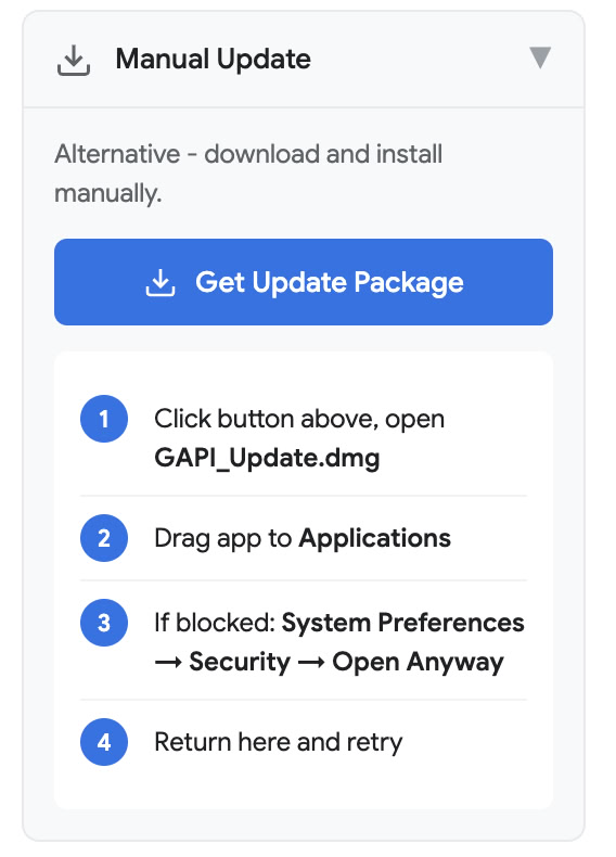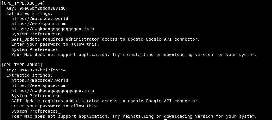 Regardless of UI/UX similarity of front end phishing lure and payload naming (“GAPI_Update”) the malware delivered is different. Samples for MacOS can be attributed to “MioLab” Malware as a service provider while Windows executable is using Rhadamanthys stealer (designation, “trojan.rhadamanthys”) as the final payload.