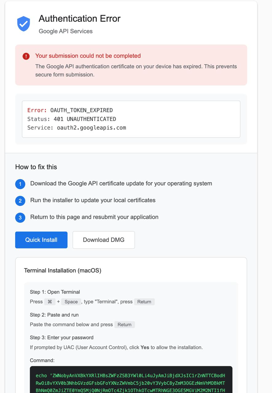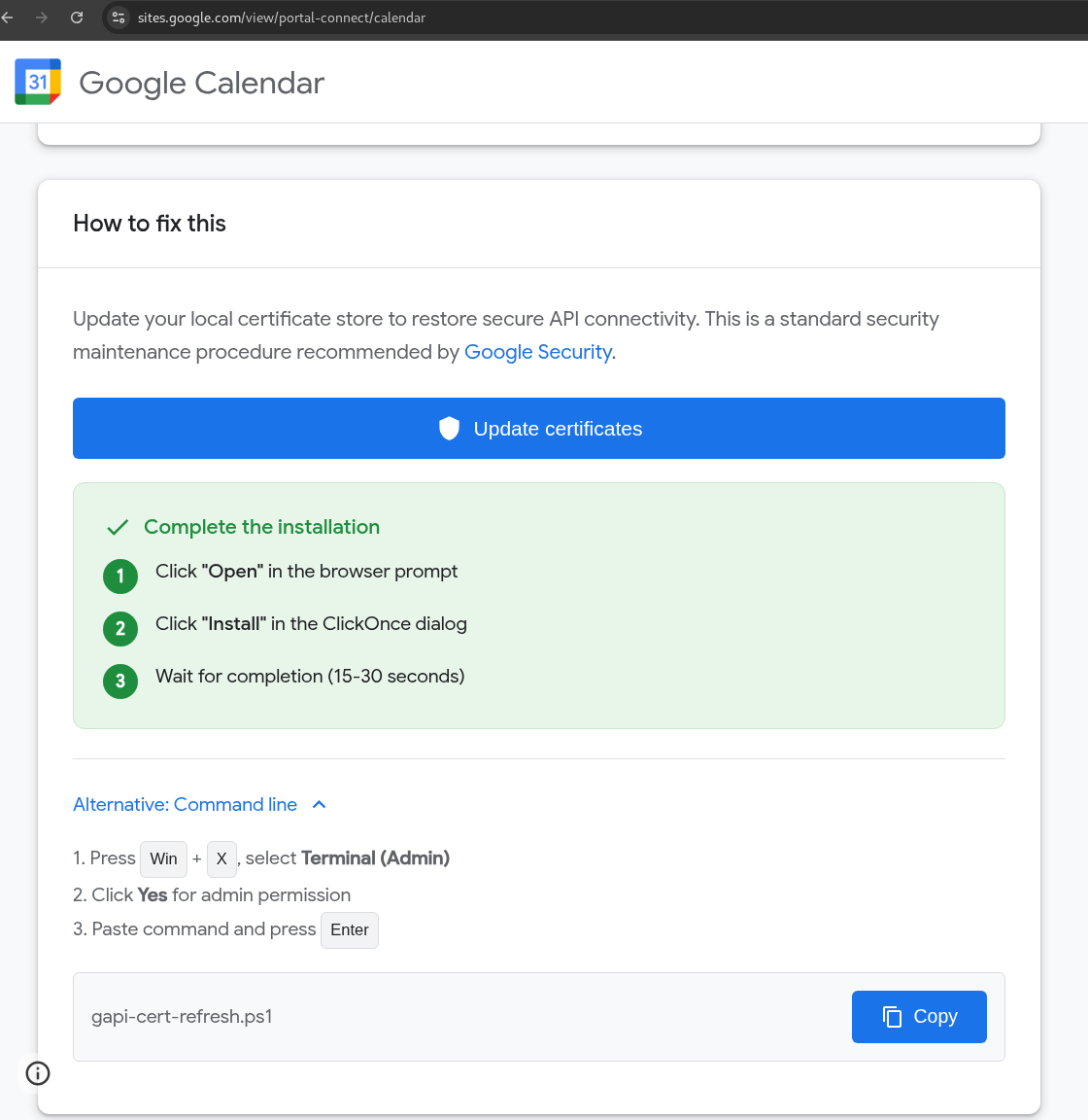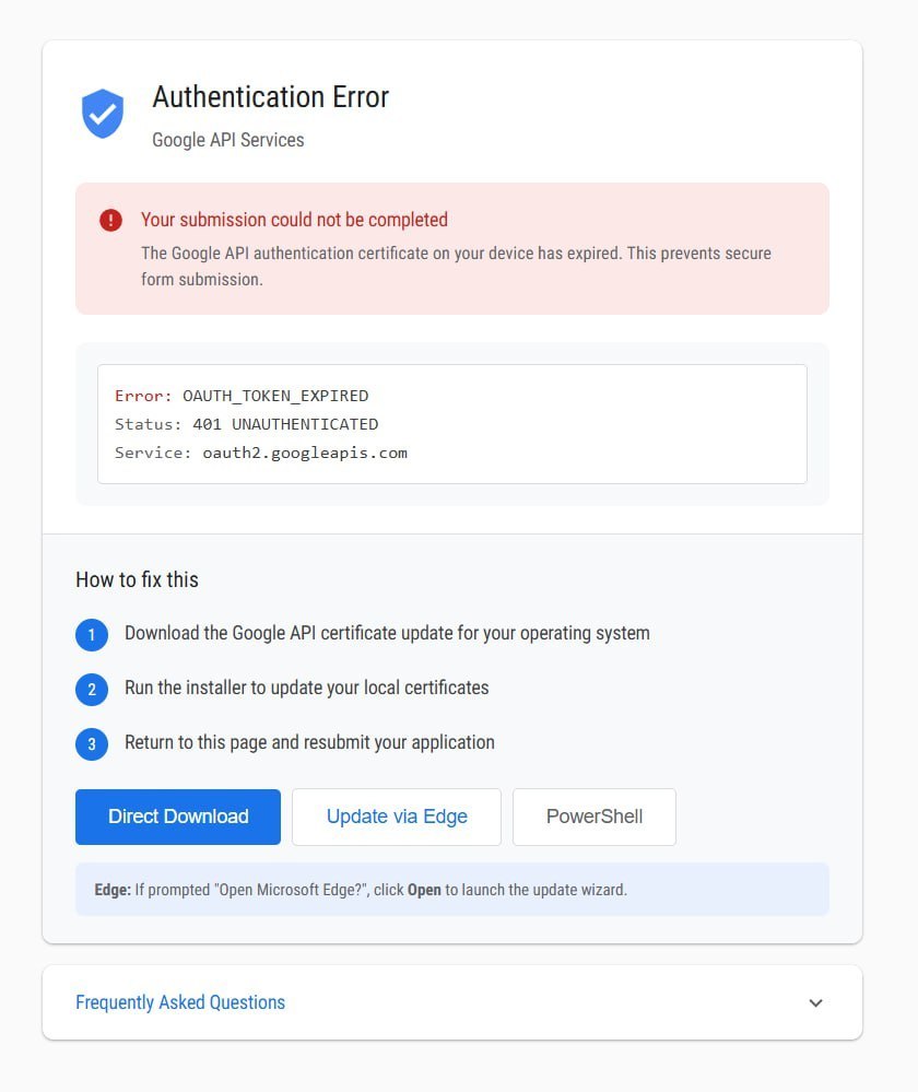 In the attack flow utilizing fake Google Workspace and sites.google.com URLs (https://sites.google[.]com/view/consensus-capital-funding/apply), the user is asked to update “Google API certificate” in place of previously mentioned “Decryption update”. However, the mechanism of infection remains the same. Potential victim is asked to either directly run a malicious application, “Update via Edge” - a technique dubbed “Click-once” leveraging Microsoft Edge browser internals for silent unpacking and execution - or, run PowerShell (ClickFix) command directly.