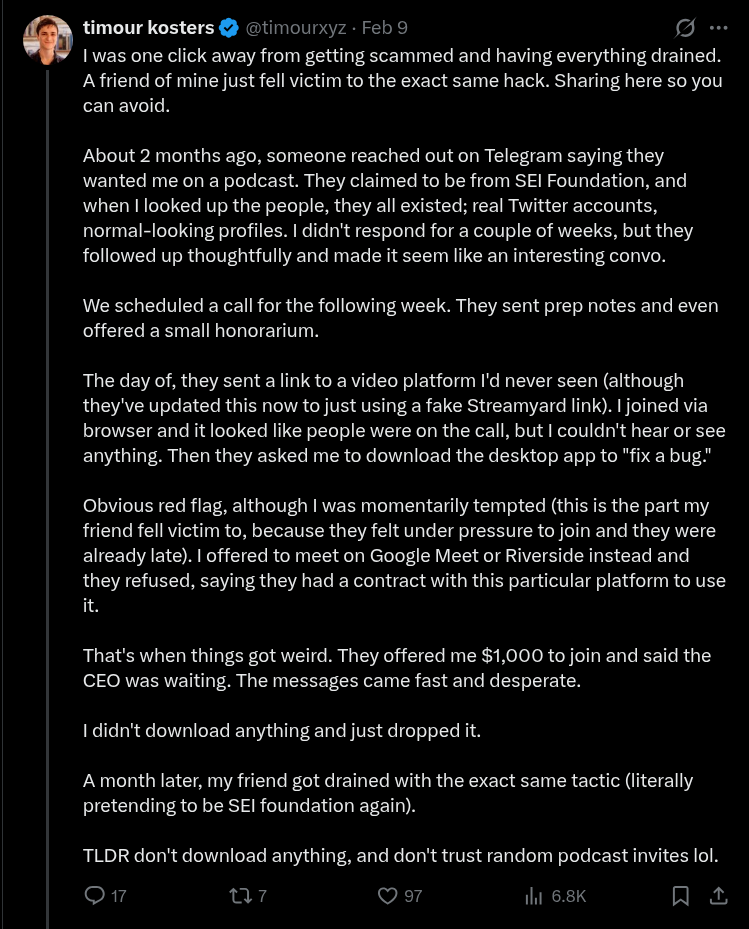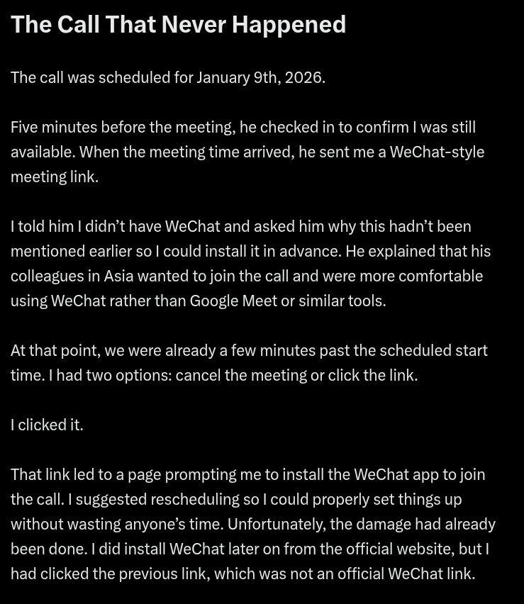 - Attackers recently began using previously compromised Telegram and X (Twitter) accounts for initial outreach, leveraging the credibility of the real (hacked) person for initial payload delivery, a method similar to DPRK Bluenoroff/DangerousPassword group.