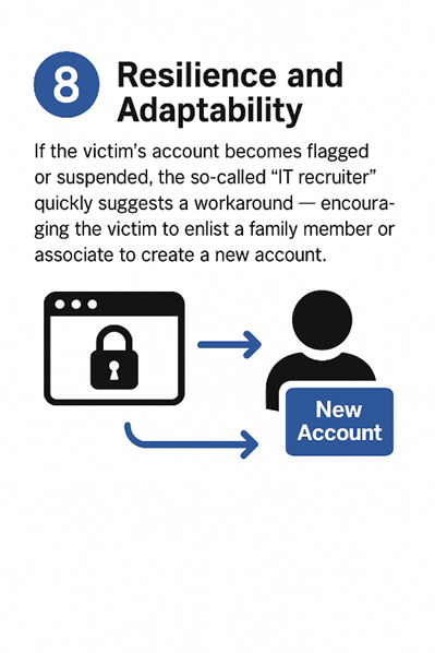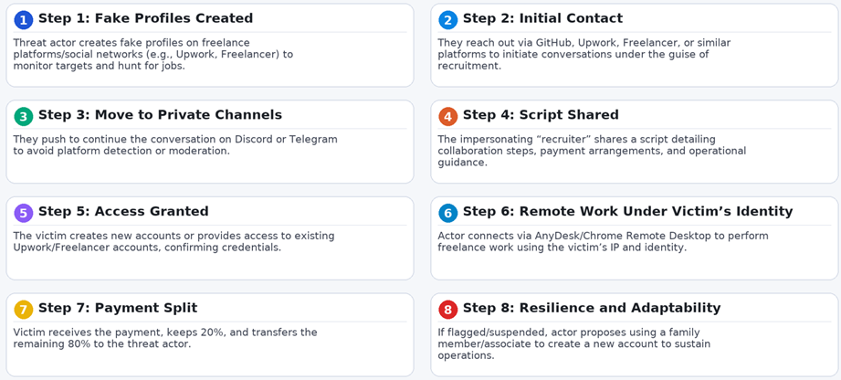 To help visualize this evolving tactic, the following graphic summarizes the eight-step operational model observed across multiple cases. This flow illustrates how DPRK-linked IT workers initiate contact, establish control over freelance accounts, and sustain long-term access through collaborator recruitment.