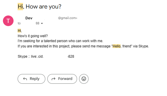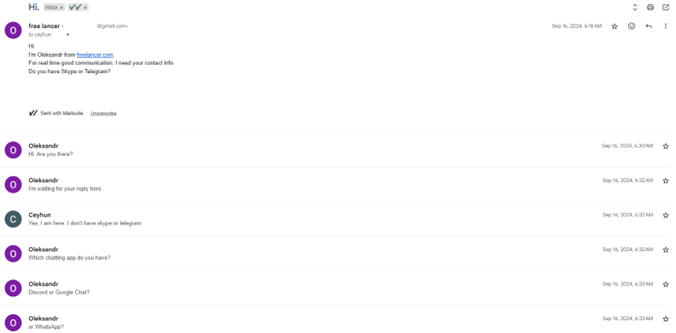 Through these job postings, they created communication channels to persuade potential victims to collaborate with them. As shown in the following image, the IT recruiter even referenced Freelancer.com during the exchange: