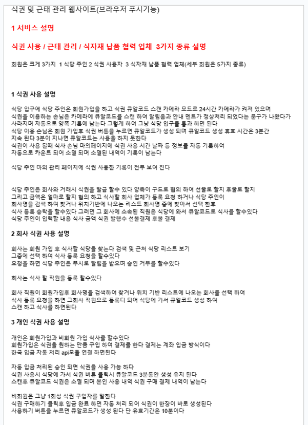 Regarding the Korean-language document: it outlines the design and functionality of a web platform for managing meal tickets, attendance, and food supply partners. Essentially, it is a digital system for meal and attendance management that connects restaurants, companies, and individual users—automating the entire process from ticket purchase to meal verification.