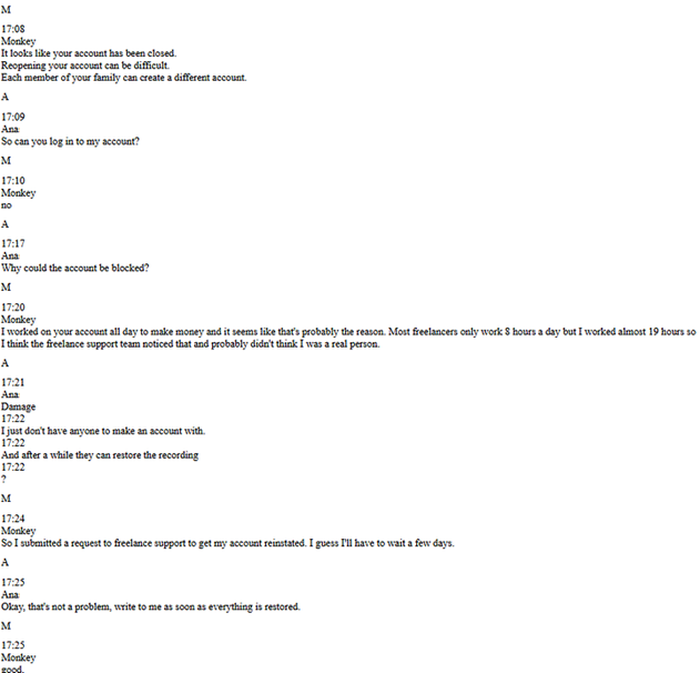It is important to note that this IT worker caused the Upwork account to be blocked due to excessive activity — working at least 19 hours, as described in the following chat: