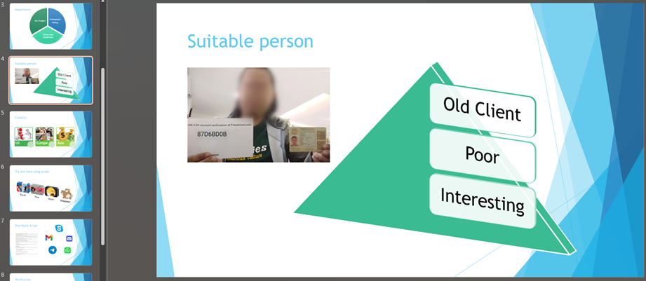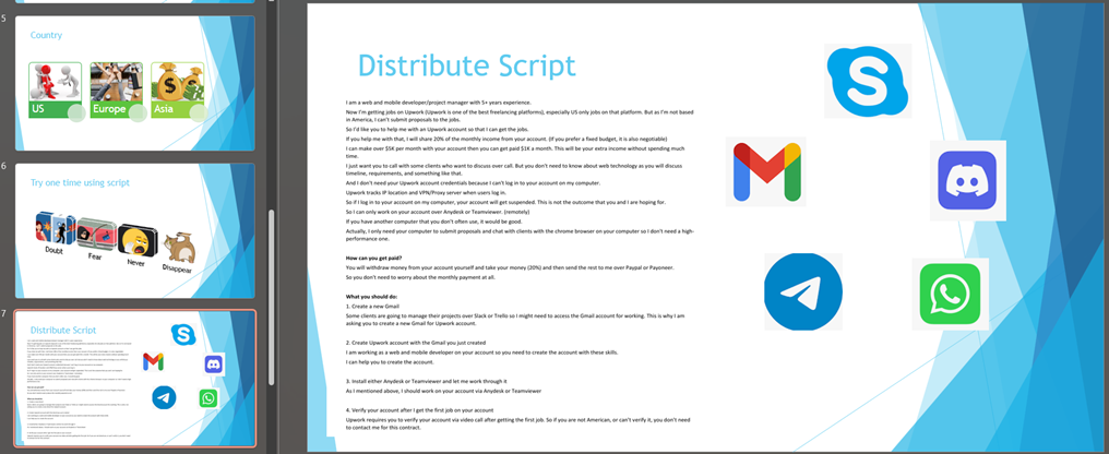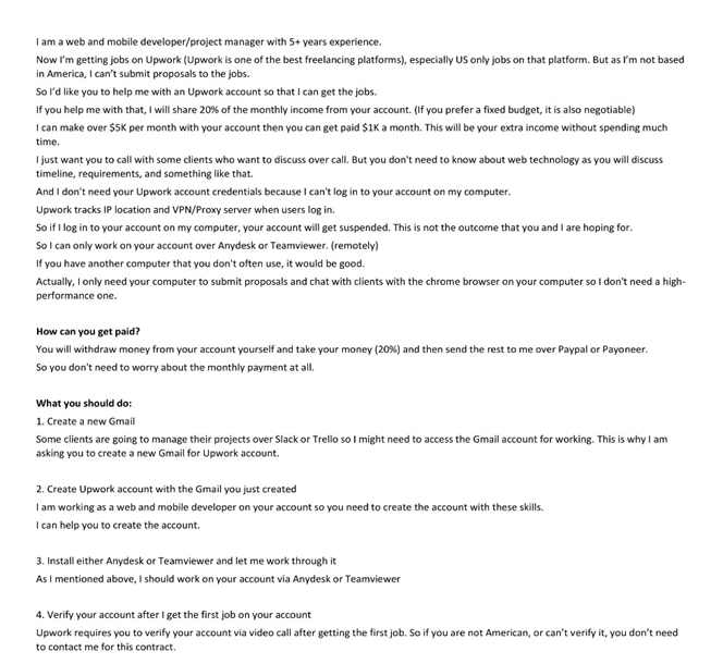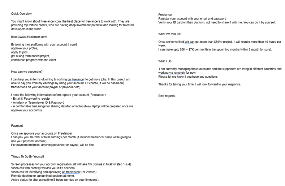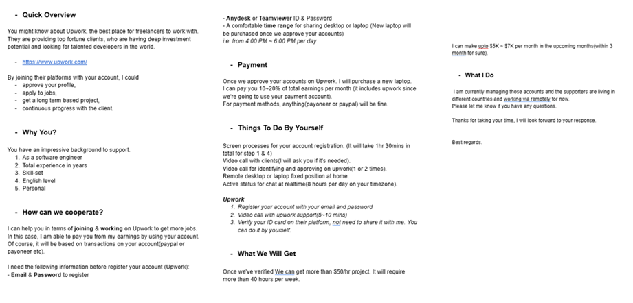 This marks the emergence of a second, more scalable phase in their operations. Increasingly, DPRK-linked IT workers are acting as recruiters, orchestrating coordinated campaigns to enlist collaborators through platforms like Upwork and Freelancer. These recruiters approach targets with a scripted pitch, requesting “collaborators” to help bid on and deliver projects. They provide step-by-step instructions for account registration, identity verification, and credential sharing.