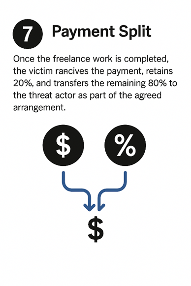 • Verify Payment Structure: Immediately report any job offer that requires you to receive a payment and then manually send a large percentage (e.g., 80%) to a third party or “teammate.” This is a classic revenue laundering scheme.