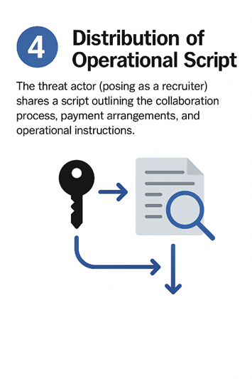 • Standardize Onboarding: Any recruiter sending a generic, pre-written “script” or operational playbook (Step 4) rather than a customized scope of work should raise suspicion. Ensure your internal recruiters are trained to use approved, non-scripted communication methods.
