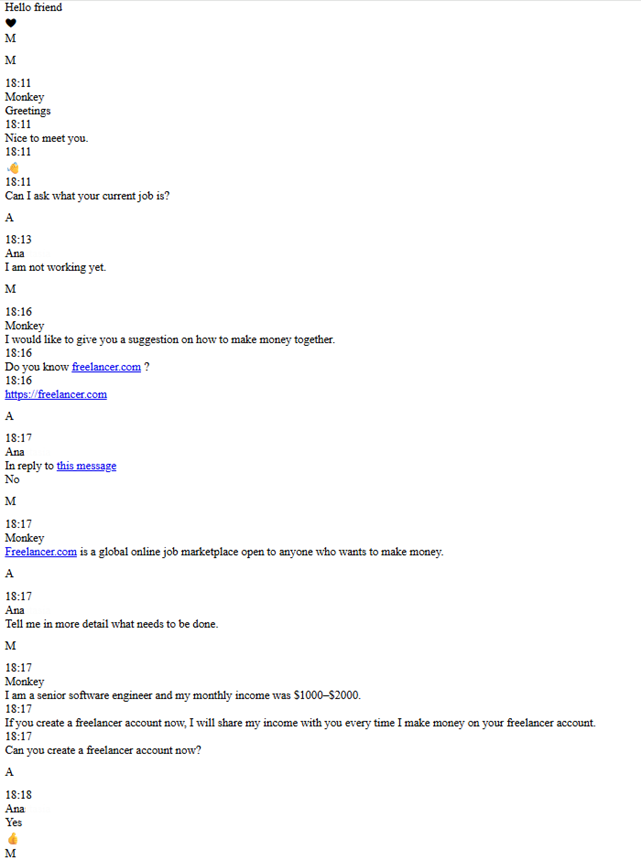 These conversations demonstrate the use of individuals as collaborators, enabling IT workers to operate under their identities. In this scenario, there is a process in which the IT recruiters manage to convince these individuals to allow them to work using a legitimate identity. The IT workers then exploit this access to “work” under the recruited person's profile — in this case, Ana.