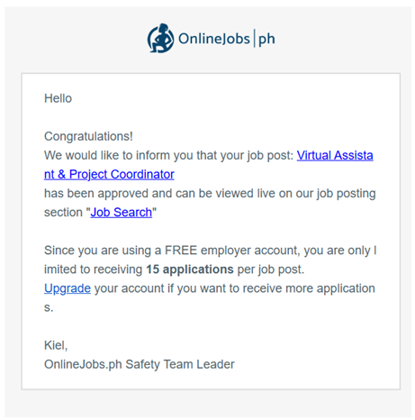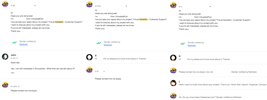 The same job offer previously posted on the earlier employment platform was also published on OnlineJobs, using the same title and description. The IT recruiter received emails in response to this posting and interacted with several individuals. Roles such as “Virtual Assistant” are particularly effective for this type of recruitment, as they can be easily misrepresented by IT recruiters to initiate collaboration under false pretenses: