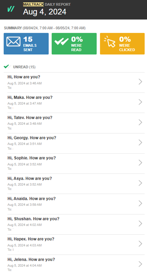 In other cases, there is evidence of mass outreach to multiple targeted accounts identified across various employment-focused social networks. They distribute offers at scale using tools like Mailsuite-Mailtrack, which allow them to monitor the status of the emails sent.