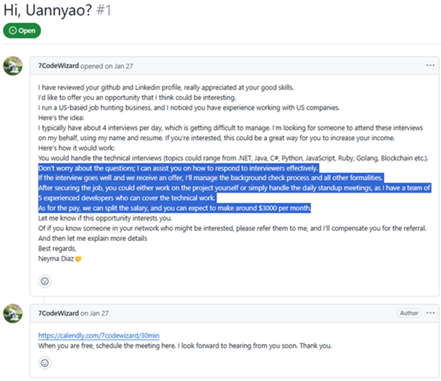 The following image illustrates the type of proposals these recruiters send to GitHub users. In some cases, conversations have been observed moving from GitHub to Discord, where the recruitment process continues more privately.