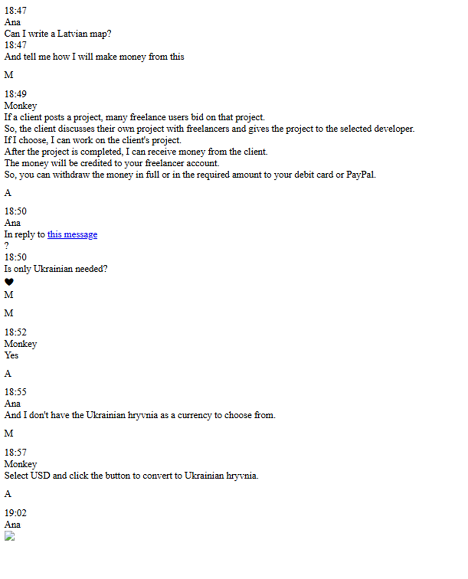 A particular aspect of this IT recruiter is their direct style of communication. It is also notable that the individuals being targeted are from Ukraine, as confirmed in this conversation. In the same exchange, Ana asks how they will make money from this arrangement: