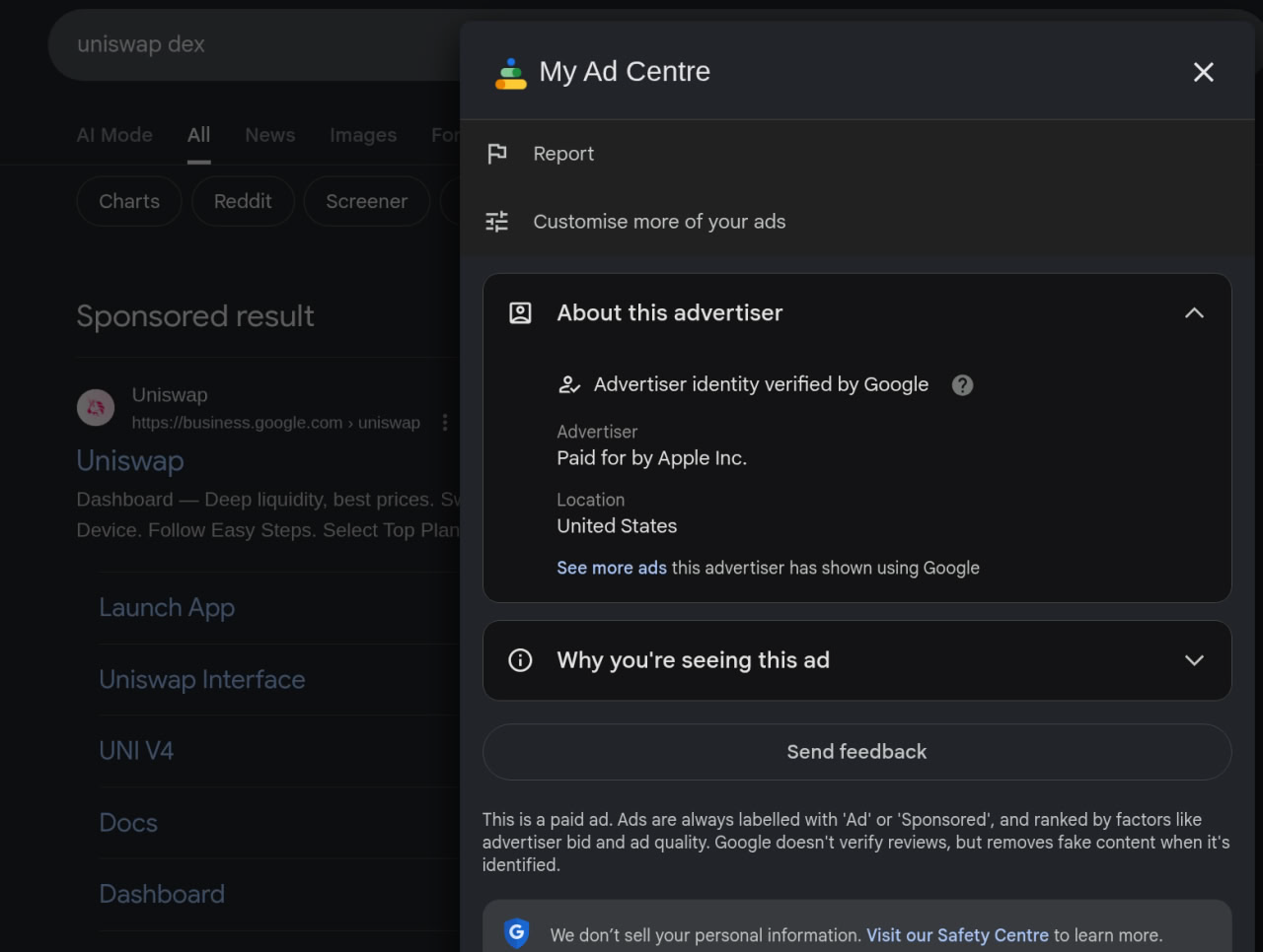 In recent weeks SEAL successfully blocked 351 malicious Google Ads URLs via Eth-Phishing-Detect. Uniswap has been the most impersonated brand, however, impersonation targets vary on a week by week basis. We often observe attackers shifting from one brand to another for weeks at a time. The most popular targets are high TVL (Total Value Locked) protocols on Ethereum (Uniswap, PancakeSwap, CoW Swap, Morpho Finance), trading platforms (Hyperliquid) as well as Solana-native applications (Jupiter, Raydium, Pump.fun)