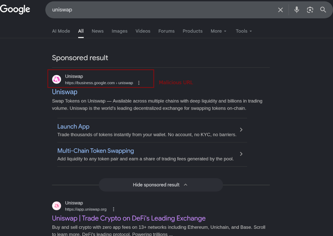 SEAL is actively tracking multiple threat actors deploying malicious Google Ads targeting DeFi applications, wallets, and other cryptocurrency-related services.