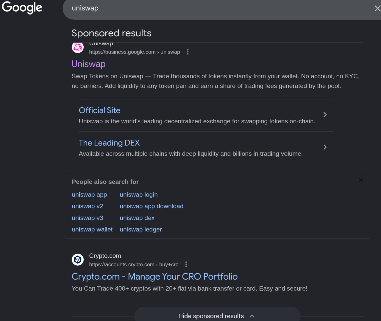 We recommend cryptocurrency users and organizations avoid using Google Search for cryptocurrency applications. We advise using only bookmarked URLs and verifying all links. The latter can be easily done with the help of cryptocurrency-specific indexing services such as https://search.defillama.com/.