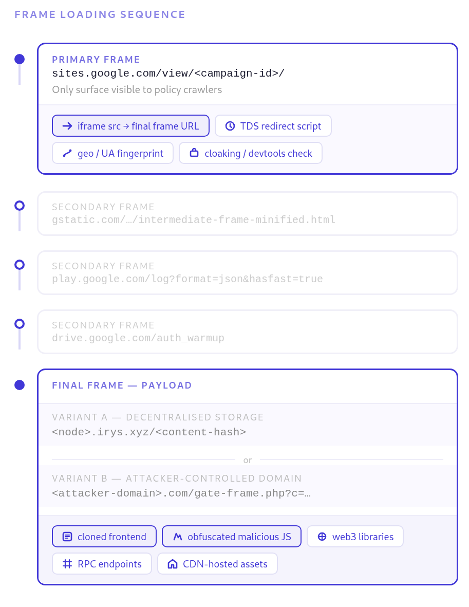 Malicious payloads as well as the cloned front end of the target application are delivered through secondary iframes, paired with fingerprinting and cloaking scripts. This architecture means that Google's automated policy checks may detect only the benign primary frame, while the actual attack surface is loaded independently in a nested context that may appear invisible to automated detection mechanisms.