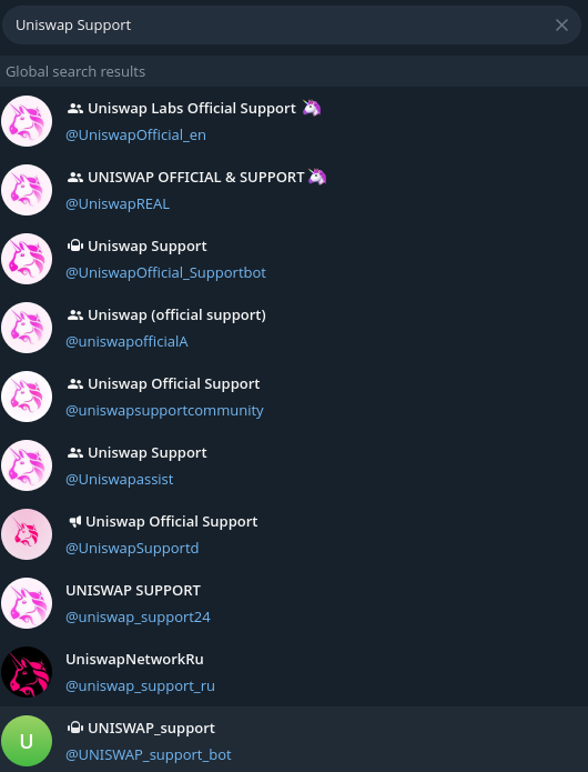 Users seeking to contact a protocol's support team frequently use Telegram's built-in search feature. Threat actors abuse this same feature by relying on Telegram's lack of verification and the fuzzy-matching of search terms.