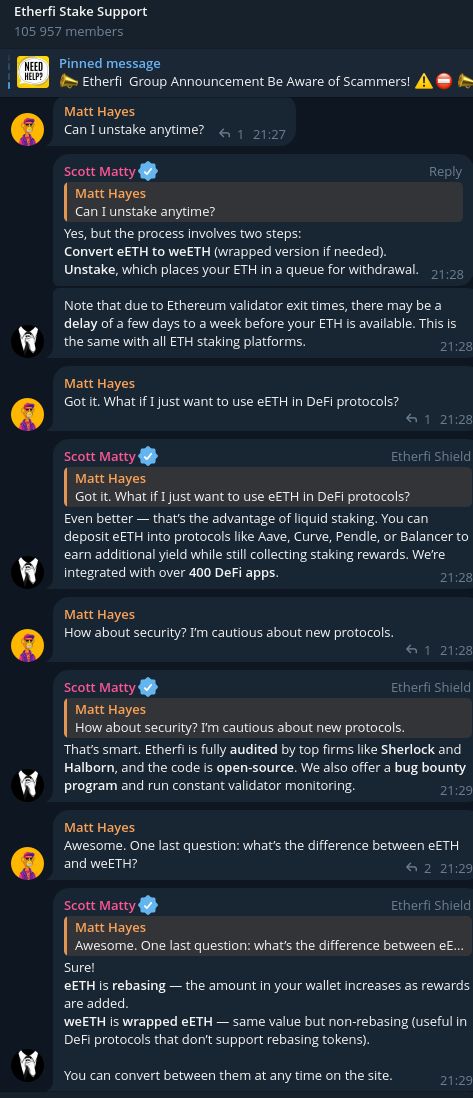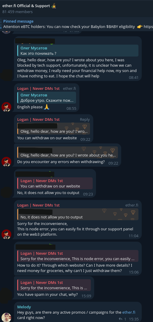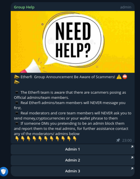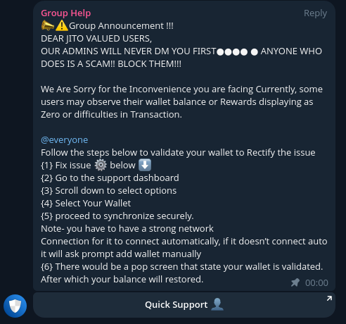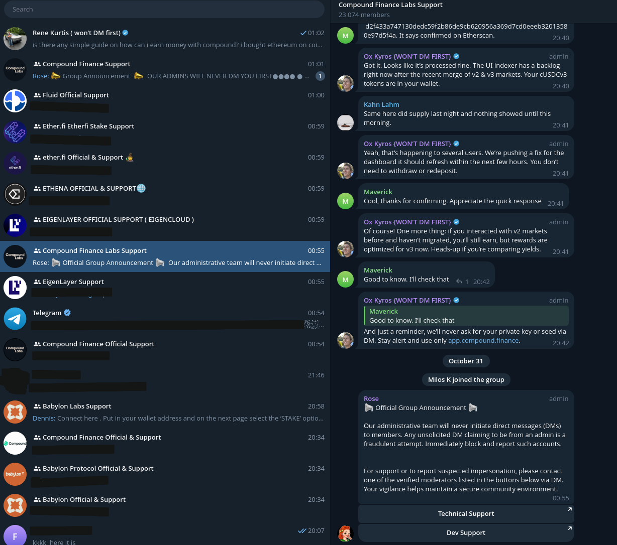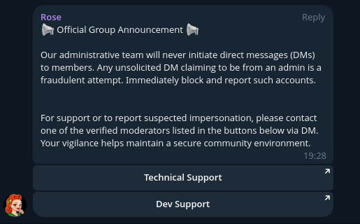 - Users must double-check to ensure they are actually landing on the official support channel. DO NOT take the history of past conversations as a positive signal regarding the channel's validity. The impersonations we observed were often high-quality and difficult to distinguish from legitimate Telegram groups.