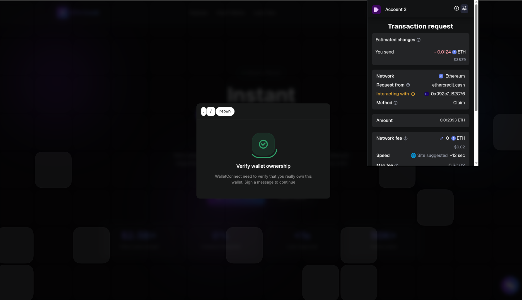 valueof0x2c07cad69f7230(approximately 0.012 ETH) being sent from the victim's wallet (<VICTIM_WALLET>) to a suspect contract (0x992c...2c76). Crucially, the input function is identified by the selector0x3158952e, which corresponds to aClaim()function. A popular choice of function signature for wallet drainers. - The balance snapshot shows the wallet's Ethereum balance dropping from a pre-transaction value of