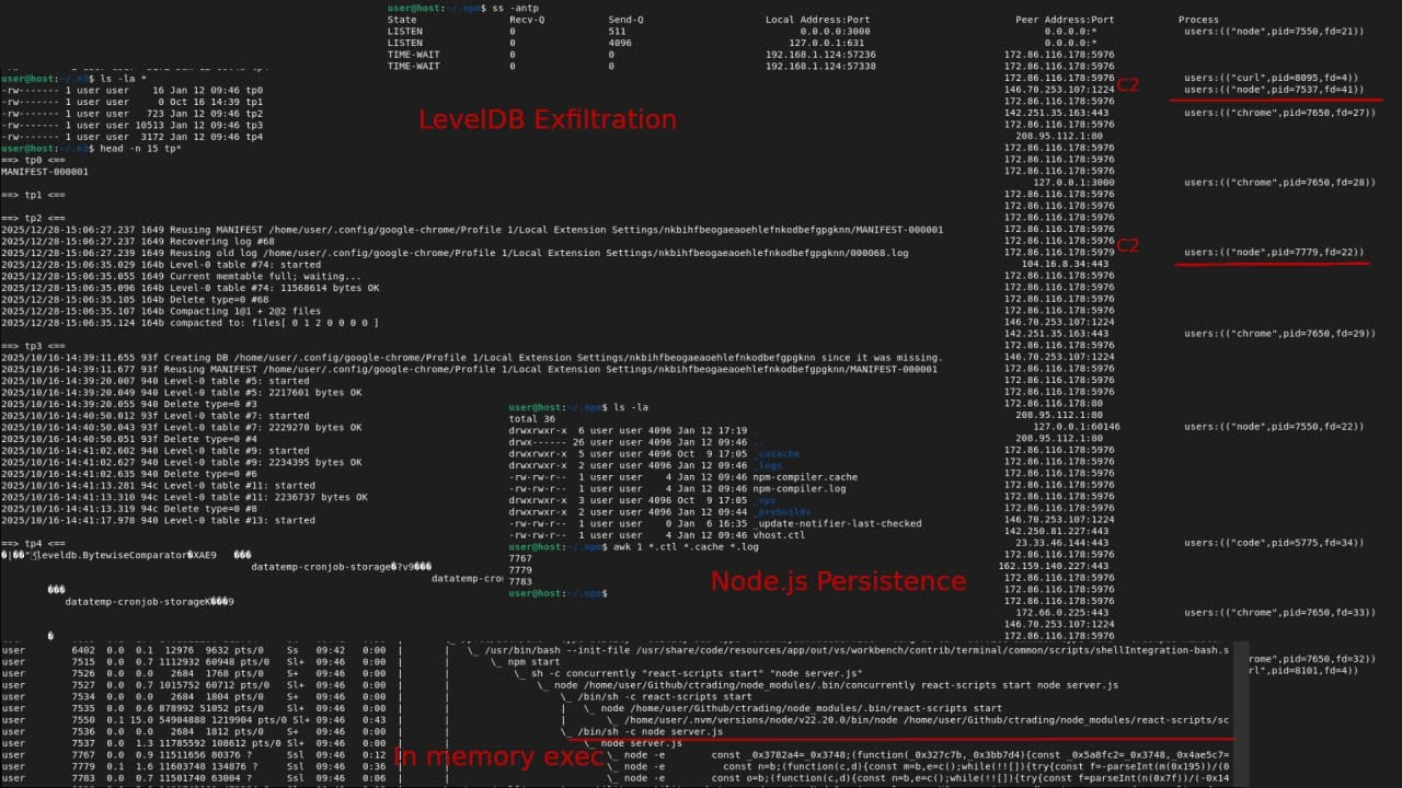 - Node.js Layer: Executes immediately upon infection to steal credentials, log keys, and establish a covert RAT within the